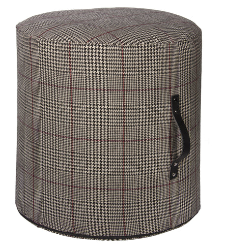 Country Style City Chic Cotswold Black Sofisticated Houndstooth Plaid Pattern Round Ottoman with Leather Handles and Nickel Rivet Feature Rigid Foam Insert with Zipper for easy removal for Laundering Proudly Manufactured in Canada