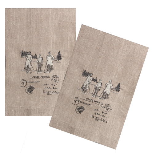 Country Style City Chic Guest Towels 16"x24" Set of 2 with Scenes D'antan Vintage Skiers embroidered on a beautiful Nuetral Linen Proudly Manufactured in Canada